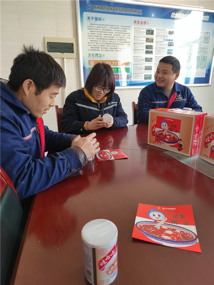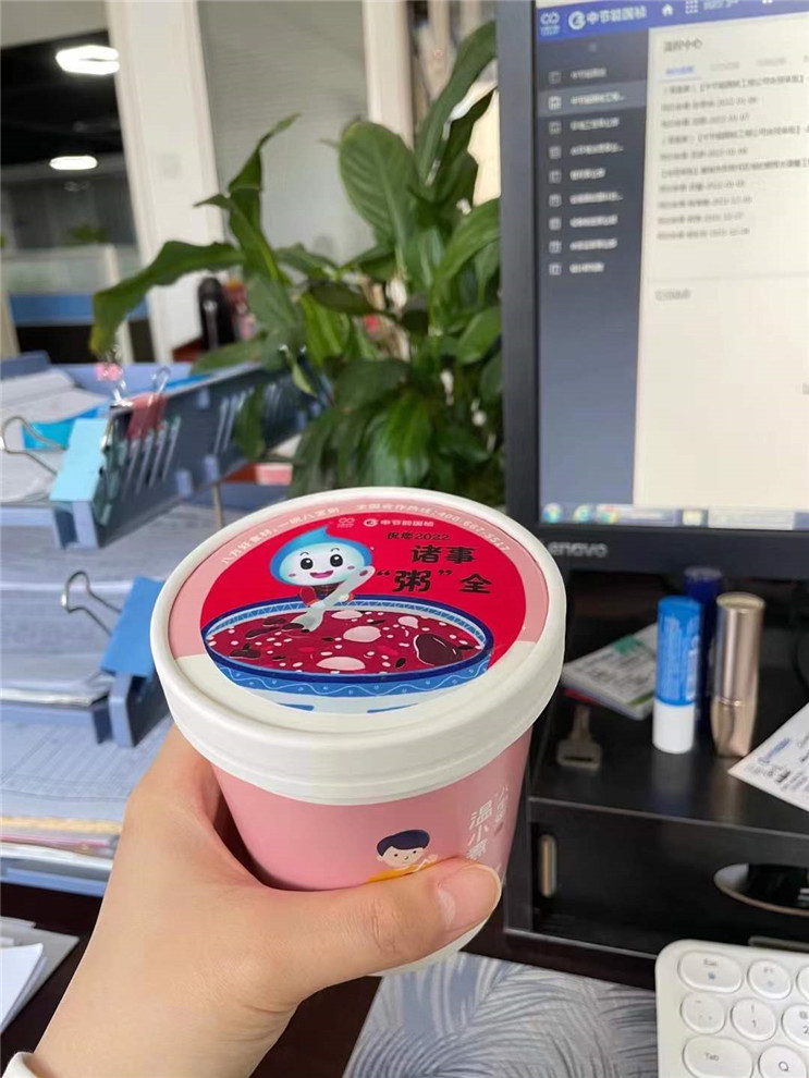 陜西彬縣由于疫情防控需要,當(dāng)?shù)刂挥袔准也惋嬮T店?duì)I業(yè),無法訂到現(xiàn)煮熱粥。彬縣國(guó)禎行政人員為了讓廠區(qū)職工喝上應(yīng)季的“臘八粥”,克服重重困難于1月9日23點(diǎn)采購(gòu)到聽裝八寶粥。