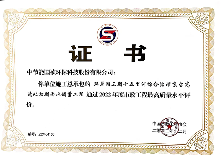 12月27日,“2022年市政工程建設(shè)產(chǎn)業(yè)博覽會(huì)” 暨中國(guó)市政工程最高質(zhì)量水平評(píng)價(jià)頒獎(jiǎng)大會(huì)在長(zhǎng)沙開(kāi)幕。中節(jié)能國(guó)禎總承包的“京臺(tái)高速處初期雨水調(diào)蓄項(xiàng)目”通過(guò)2022年度“市政工程最高質(zhì)量水平評(píng)價(jià)”。同時(shí),我公司作為建設(shè)單位的清溪凈水廠PPP項(xiàng)目和胡大郢污水處理廠PPP項(xiàng)目也獲此殊榮。