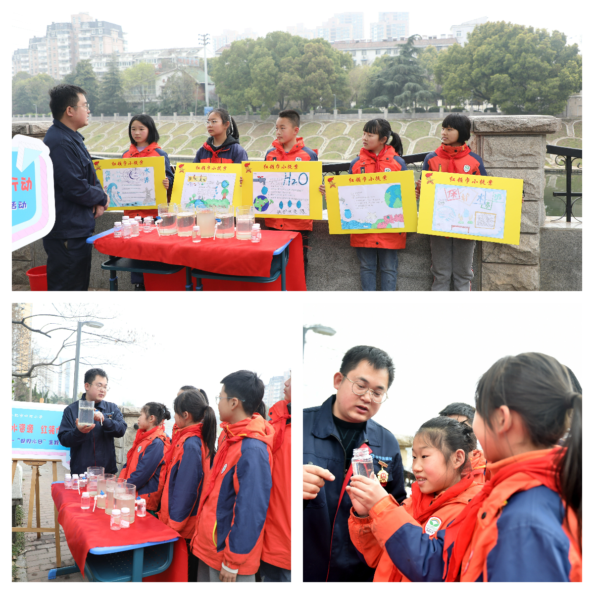 儀式結(jié)束后,全國技術(shù)能手、“安徽省五一勞動獎?wù)隆鲍@得者、中節(jié)能國禎員工楊策,帶領(lǐng)四河小學五(2)中隊同學們來到南淝河邊,開展了一場別具一格、內(nèi)容精心設(shè)計,以“珍惜水環(huán)境 紅領(lǐng)巾在行動”為主題的世界水日實踐活動?;顒又胁粌H有“世界水日”知識競答比賽、“污水變清泉”動手實驗,學生們還現(xiàn)場開動腦筋,拿出污水防治的“紅領(lǐng)巾小提案”。珍惜水、節(jié)約水、保護水資源的環(huán)保理念逐漸深入孩子們的心中。